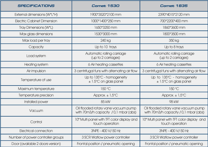 The panels are placed over specially designed trays that allow the air flow. Each tray has an integrated silicon surface that replaces the use of traditional vacuum bags, therefore avoiding all the problems that arise from them. The trays are stiff in order to avoid deformation of the panels and are all located in a carriage which is automatically loaded into the oven.